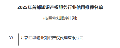 为进一步促进行业健康发展,培养良好社会信用环境,维护会员及社会公众合法权益,引导知识产权服务行业从业单位诚实守信,规范执业,根据《首都知识产权服务行业信用信息公开办法》第八条的相关规定,首都知识产权服务业协会通过向会员单位公开征集、审核,经本会四届二次理事会审议,通过了2025年首都知识产权服务行业信用推荐名单。汇思诚业凭借“务实诚信、精业守道”的企业精神,经过多维度的严格评选,成功入选该名单。这是对汇思诚业长期以来坚持诚信经营、规范执业的高度认可,也是我们为客户提供优质服务的坚实证明。