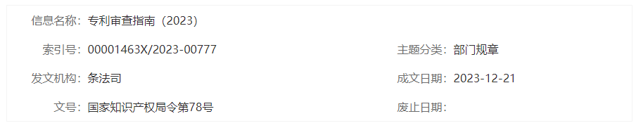 根据《中华人民共和国专利法实施细则》,制定《专利审查指南》。现公布修订后的《专利审查指南》,自2024年1月20日起施行。2010年1月21日公布的《专利审查指南》及其后公布的相关局令、公告同时废止。