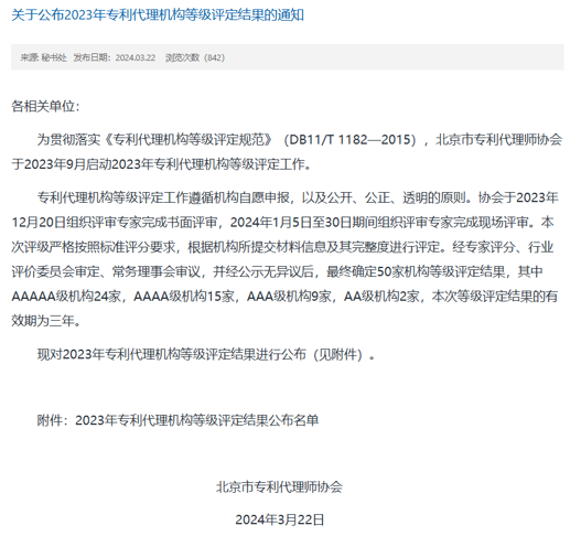 『特許代理機構等級評価規範』(DB11/T 1182-2015)を貫徹、実行するために、北京市特許代理士協会は2023年9月に「2023年度特許代理機構等級評価」作業を開始した。今回の評価作業は公開、公正、透明の原則に従う。2023年12月20日に書面審査が完了し、2024年1月5日から30日まで現地審査が実施された。今回の格付けは、基準採点要件に厳格に準拠し、機構が提出した材料情報とその完全性に基づいて評価された。専門家の評価、業界評価委員会の検定、常務理事会の審議、公示期間中の異議なしを経て、最終的に50の機構の等級評価結果を確定した。その中に5A級機構が24社、4A級機構が15社、3A級機構が9社、2A級機構が2社があった。ユニインテルは、5A級機構に認定された。