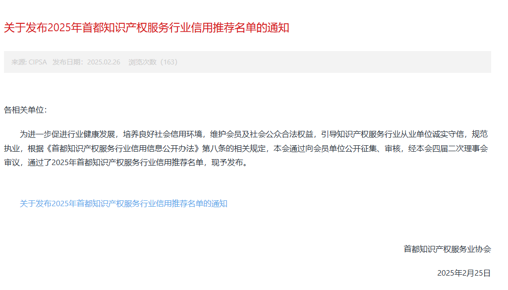 業界の健全な発展をさらに促進し、良好な社会信用環境を育成し、会員及び社会公衆の合法的権益を守り、知的財産権サービス業の事業者に誠実かつ信頼できる業務の遂行を促すため、首都知的財産権サービス業協会は、《首都知的財産権サービス業信用情報公開弁法》第8条の関連規定に基づき、会員企業からの公募と審査を経て、第4期第2回理事会での審議・承認を経て「2025年首都知的財産権サービス業信用推薦リスト」を発表した。